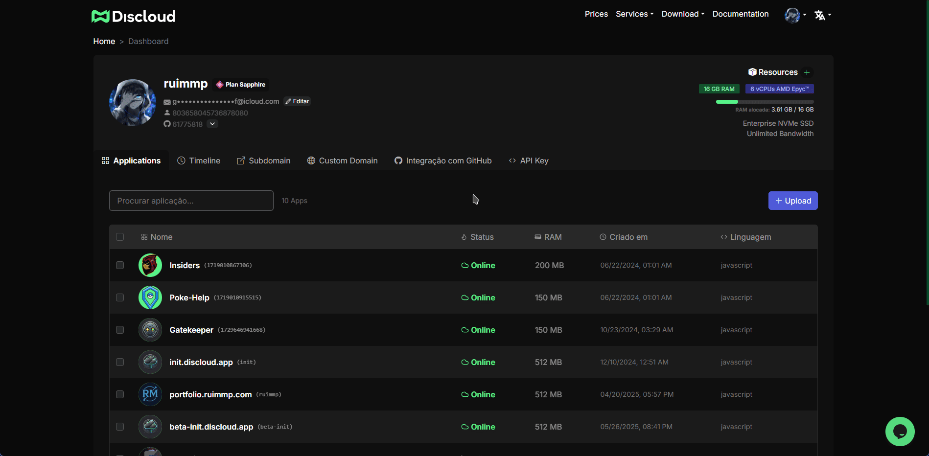 * Vá para [Painel Discloud](https://discloud.com/dashboard)