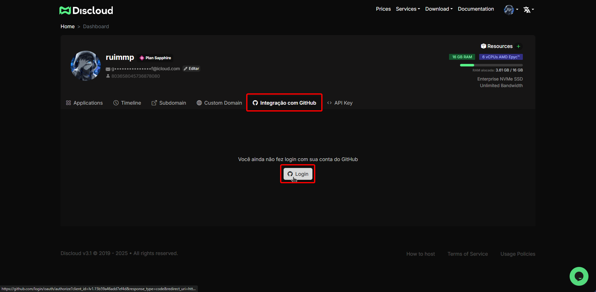 * Go to [Discloud Dashboard](https://discloud.com/dashboard) → **GitHub Integration** tab