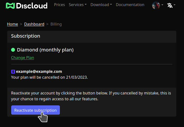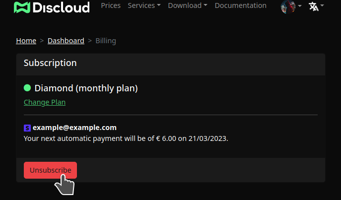 Esta página cobre como gerenciar uma assinatura paga existente adquirida através do site da Discloud (Stripe). Se você precisar comprar um plano, veja: [Planos e Suporte](https://docs.discloud.com/about/donations).